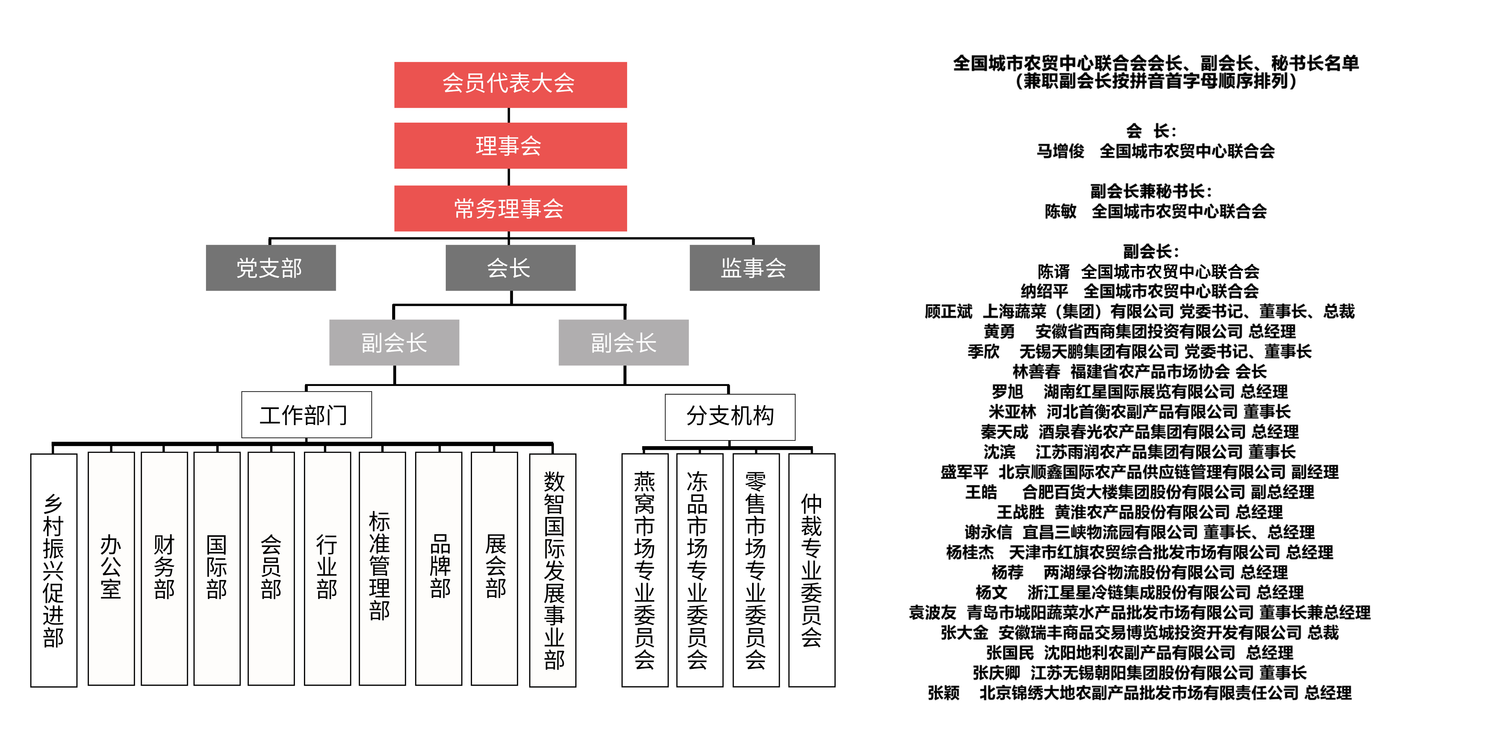 第一条 全国城市农贸中心联合会是由农产品批发市场、零售市场、经销商、生产基地、设施设备及相关服务供应商等有关企事业单位、科研单位、社会团体和个人自愿结成的全国性、行业性社会团体。