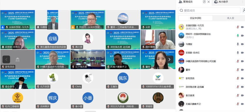 9月2日全国农贸联组织举行的农产品供应链合作及采购说明会,作为本次产销大会的首场活动,于线上举行,内蒙古食全食美股份有限公司、南京农副产品物流配送中心有限公司、深圳市海吉星国际农产品物流管理有限公司、北京一亩田新农网络科技有限公司、无锡天鹏菜篮子工程有限公司、重庆观音桥市场有限公司、深圳市鑫鸿泰果蔬有限公司等大型农批市场及经销商代表就农产品市场的新变化、农产品批发市场及经销商等与产地的供应链合作方式、要求、产销对接的措施,以及采购需求品类等信息进行分享交流。“五省两市一区”的农产品产地政府部门、生产基地、供应商等有关负责人在线上参加会议。