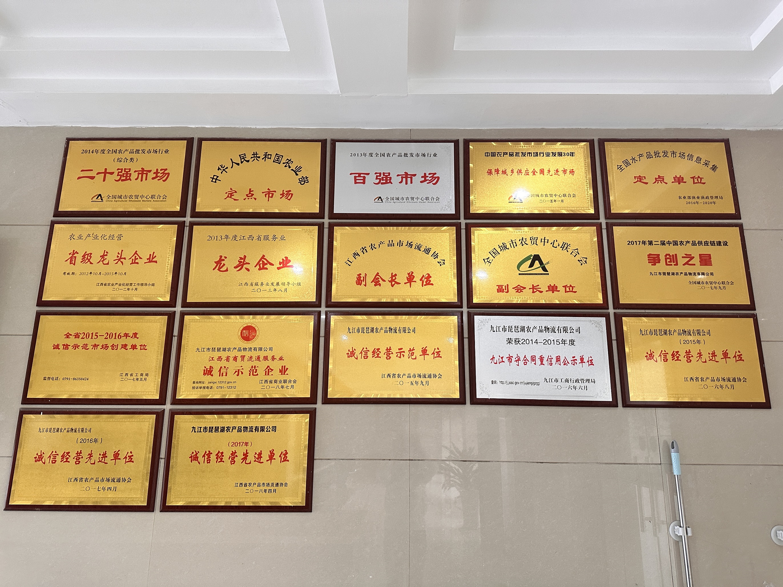 市场简介:九江市琵琶湖农产品物流有限公司(简称:九江琵琶湖公司)是由国内最大的农产品流通领域国有上市企业——深圳市农产品集团股份有限公司(股票代码:000061)与白水湖街道三里村所属九江市琵琶湖农副产品批发市场有限公司共同组建,项目占地约180亩,总投资2.73亿元(市场分两期建设,一期水产区用地面积为18847平方米,建筑面积约12040平方米,投资额约0.53亿元;二期蔬菜、水果、家禽区用地面积为82008平方米,建筑面积为68021平方米,投资额约 2.2亿元),属浔阳区重点招商引资项目,也是九江市唯一一家综合性农产品一级批发市场。九江琵琶湖公司于2010年11月11日注册成立,注册资本16000万元。项目自2010年开工建设以来,在集团公司和当地政府职能部门的指导和关怀下,各项工作进展顺利。2012年3月和2014年8月,市场水产交易区和蔬菜交易区、家禽交易区分别正式营业,果品交易区于2016年8月开始试营业,至此九江琵琶湖市场形成了全品类开业的状态。场内现有经营户近500户,年交易量约40万吨,交易额约30亿元。九江市琵琶湖公司由此也成为了九江市最大综合类的农产品批发市场,特别是近年来的飞速发展,使公司荣膺了全国二十强市场、全国蔬菜批发百强市场、全国信息采集定点单位、全国农业农村部定点市场、省级龙头企业、省市诚信经营示范企业等荣誉称号。